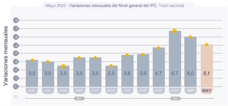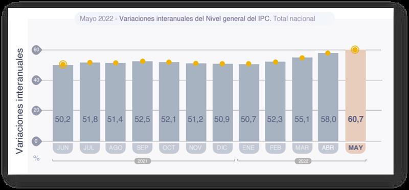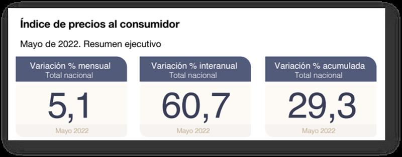 El nivel general del Índice de precios al consumidor (IPC) representativo del total de hogares del país registró en mayo una variación de 5,1% con relación al mes anterior, 29,3% en los primeros cinco meses del año y del 60,7% en el interanual.