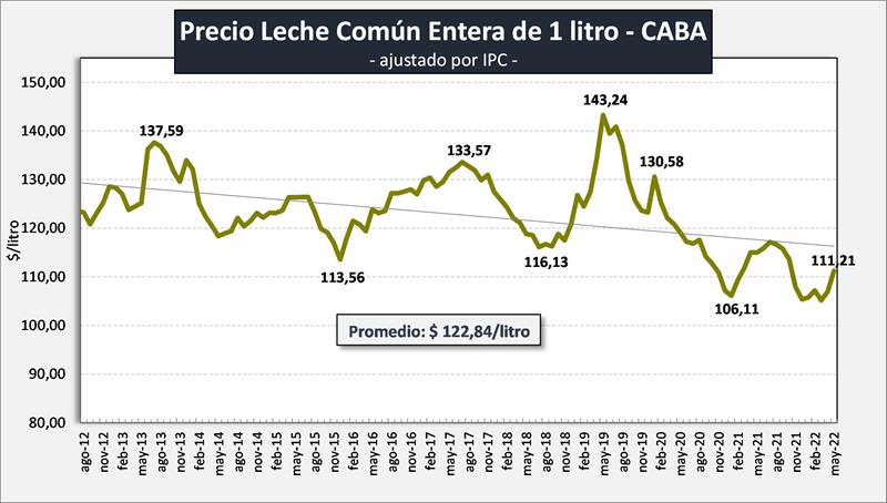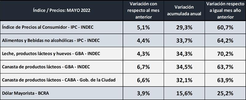 Según datos publicados por la Dirección General de Estadísticas y Censos - Ministerio de Hacienda del Gobierno de la Ciudad de Buenos Aires, los precios de los productos lácteos de esta canasta, tuvieron un crecimiento mensual promedio ponderado del 6,6%, en los cinco primeros meses del 2022 un 32,1%, e interanual del 63,9%. El ponderado es elaborado por OCLA sobre el mismo criterio mencionado para la canasta GBA de INDEC.