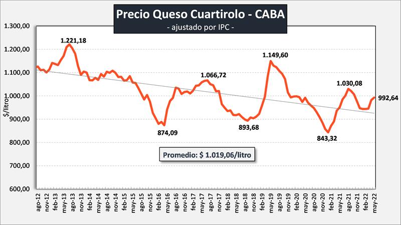 En el caso del queso cuartirolo, tiene una situación bastante similar a la planteada en el caso de la leche fluida. Estuvo en descenso prácticamente dos años, con recupero en los primeros ocho meses del 2021, y en mayo 2022 está -2,6% que el promedio y 13,7% por debajo del máximo de mediados del 2019 y 18,7% por debajo del máximo de esta serie a mediados del 2013, lo cual marca claramente una tendencia descendente en el precio en esta serie histórica de 10 años.