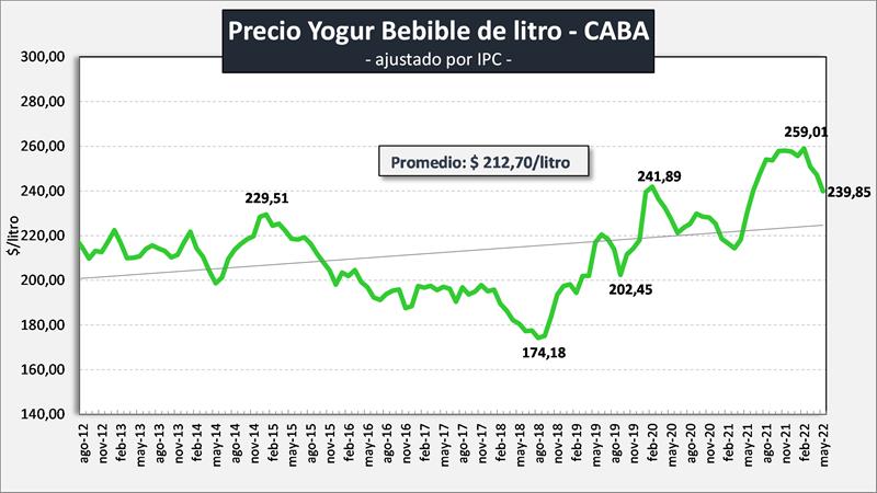 La situación de los yogures bebibles de litro es diferente, sostienen el nivel de consumo de la categoría, sus precios se ajustaron con el ritmo inflacionario, frenándose en los últimos dos meses de 2021, cayendo en enero de 2022, recuperando un 1,3% en febrero último y cayendo desde marzo a mayo. Lamentablemente tiran para abajo el promedio del mix, ya que su aumento de ventas no fue acompañado por las ventas de yogures en pote, postres y flanes que tienen un mayor valor por litro equivalente.