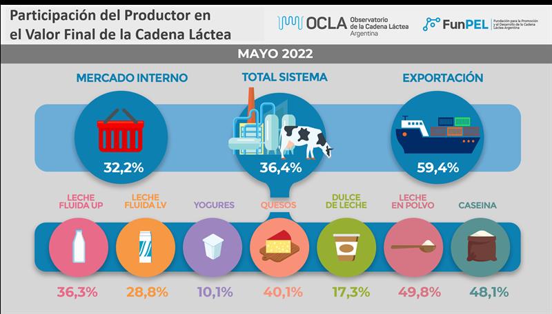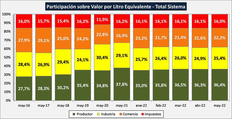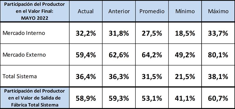 La participación del productor en el total del sistema fue para mayo de 2022 del 36,4%, +0,1 puntos por encima del mes anterior, bastante por encima de la media del 31,5%. Un aumento de 0,4 puntos los valores finales de mercado interno y una caída de 3,2 puntos porcentuales en la participación de los valores de mercado externo, colocándola 4,8 por debajo de la media histórica de la serie disponible (64,2%). La participación del productor sobre el valor de salida de fábrica (precio al que vende la industria) fue de 58,9%, 0,4 puntos debajo del mes pasado y 5,8 puntos encima del promedio de la serie (53,1%). Cabe recordar que la serie histórica para los valores de salida de fábrica tiene una mayor extensión temporal que el resto.