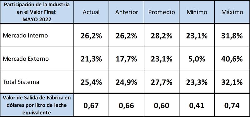 La industria mantiene en mayo de 2022 su performance de participación en el mercado interno, en el mercado externo mejora 3,6 puntos su importancia relativa (21,3%) y en general mejora su participación en el total del sistema 0,5 puntos. La facturación total de salida de fábrica por litro de leche equivalente estuvo en US$ 0,67 (1 centavo más que el mes anterior), +US$ 0,07 que el promedio de la serie disponible y 7 centavos menos que el máximo logrado en mayo y octubre de 2013. Estos niveles de facturación en ambos mercados como en el total, están muy lejos de los valores que se logran en los principales países lecheros que se ubican en un valor cercano al dólar por litro equivalente (en planchada de fábrica) y que no se dan en Argentina por las interferencias entre el mercado y los actores de la cadena que mencionamos más arriba. Además, la mejora se debe más a un retraso del tipo de cambio que a una mejora del valor en pesos.
