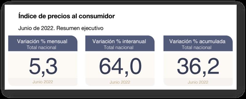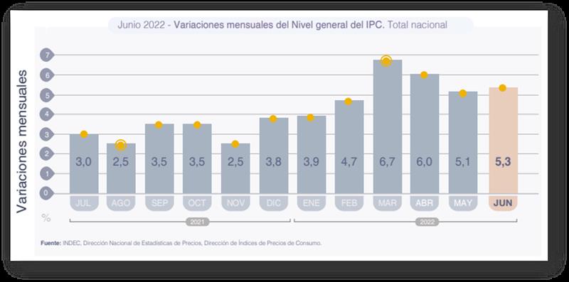El nivel general del Índice de precios al consumidor (IPC) representativo del total de hogares del país registró en junio una variación de 5,3% con relación al mes anterior, 36,2% en el primer semestre del año y del 64,0% en el interanual.