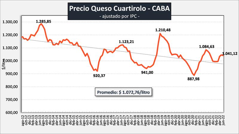 En el caso del queso cuartirolo, tiene una situación bastante similar a la planteada en el caso de la leche fluida. Estuvo en descenso prácticamente dos años, con recupero en los primeros ocho meses del 2021, y en junio 2022 está -2,9% que el promedio y 14,0% por debajo del máximo de mediados del 2019 y 19,0% por debajo del máximo de esta serie a mediados del 2013, lo cual marca claramente una tendencia descendente también en el precio en esta serie histórica de 10 años.
