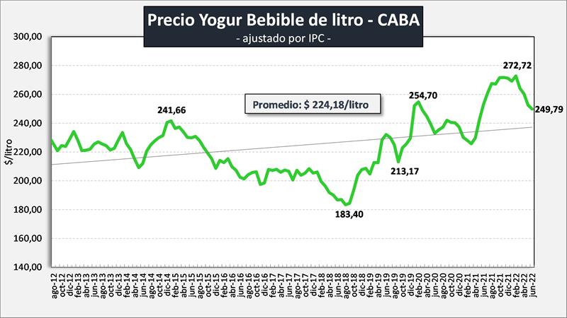 La situación de los yogures bebibles de litro es diferente, sostienen el nivel de consumo de la categoría, sus precios se ajustaron con el ritmo inflacionario, frenándose en los últimos dos meses de 2021, cayendo en enero de 2022, recuperando un 1,3% en febrero último y cayendo desde marzo a junio. Lamentablemente tiran para abajo el promedio del mix, ya que su aumento de ventas no fue acompañado por las ventas de yogures en pote, postres y flanes que tienen un mayor valor por litro equivalente.