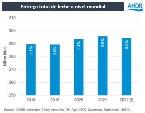 Las entregas mundiales de leche continuaron registrando un déficit interanual en mayo, con pocas expectativas de recuperación para el resto del año. Según las últimas previsiones para las principales regiones productoras de leche, parece que la producción mundial registrará una disminución del 0,5 % interanual para 2022. Esta es una reducción con respecto a la previsión de abril, en la que se esperaba que la producción se mantuviera estable durante el año.