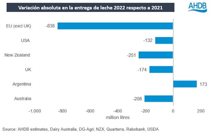En términos de volumen, la disminución prevista en la UE será la mayor, 838 millones de litros menos que los niveles de 2021. Los principales causantes son la menor calidad del pasto debido al clima cálido y seco y el menor uso de alimentos debido a la falta de disponibilidad y el aumento de los costos. También se espera que estos factores reduzcan el contenido de grasa y proteína de la leche, reduciendo la disponibilidad de sólidos lácteos para el procesamiento, según las últimas perspectivas a corto plazo de la UE.