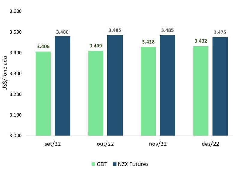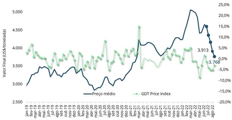 Para comprender el impacto de las negociaciones del evento GDT en el mercado interno, podemos considerar el tipo de cambio de este lunes (15/08/2022) — R$ 5,09 — y el valor de la LPE internacional (US$ 3.417 / tonelada) , para llegar al precio equivalente de una leche importada colocada en Brasil, que sería de R$ 2,08/litro .
