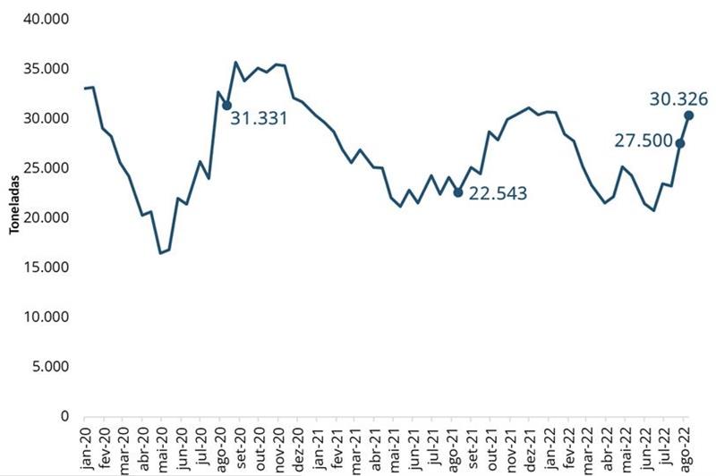 En esta quincena se registró un incremento en el volumen transado . Se negociaron un total de 30.326 toneladas de productos lácteos, un volumen un 10,28% superior al de la última subasta. Aún con el aumento en el volumen vendido, este evento tuvo el segundo volumen transado más bajo de la serie histórica para la segunda quincena de agosto, solo superado por el año pasado.