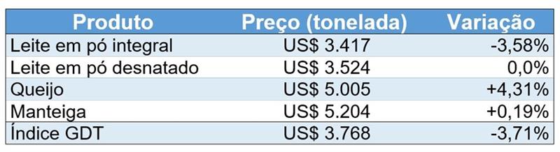 Entre las variaciones en los precios, se observaron los siguientes movimientos : leche en polvo descremada (0,0%, cerrando en US$ 3.524 /ton), quesos (+4,31%, cerrando en US$ 5.005 /ton), manteca  (+0,19 %, cerrando en US$5.204/ton).