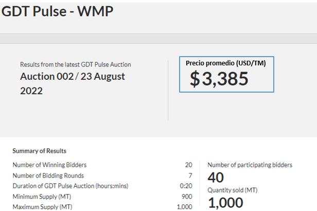 La Subasta Nº 002 se ha llevado ha cabo en el día de hoy, martes 23 de agosto, donde el precio promedio obtenido para la LPE ha sido de 3.385 US$/t , un poco menor (-1,2%) a lo publicado en el primer GDT pulse (3.425US$/t) y también menor (-0,9%) al último evento del GDT (3.417 US$/t).
