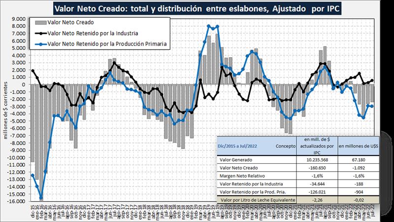 El gráfico siguiente muestra los resultados sectoriales actualizados por IPC y en el cuadro se puede ver claramente qué en estos últimos casi 7 años, la cadena no retuvo del valor que generó, $ 2,26 o US$ 0,02 por litro de leche equivalente, perdiendo esa mayor diferencia el sector primario respecto al industrial (80/20).
