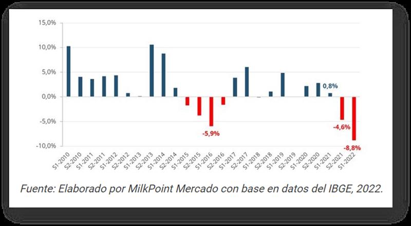 Por lo tanto, el primer semestre de 2022 presenta un mal resultado para la oferta de leche, con una disponibilidad deteriorada, reflejando un escenario difícil que se enfrenta desde 2021.
