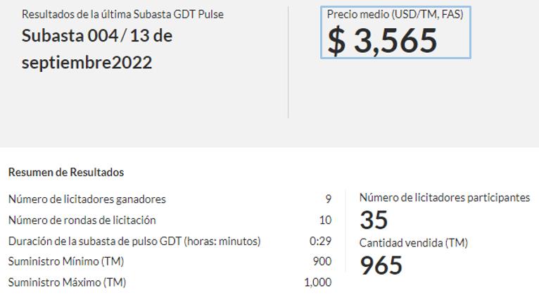 La Subasta Nº 004 se ha llevado ha cabo en el día de hoy, martes 13 de septiembre, donde el precio promedio obtenido para la LPE ha sido de 3.565 US$/t , lo que implica una suba de +4,4% respecto a lo publicado en la última GDT pulse (3.415US$/t). Respecto al último evento del GDT (3.610 US$/t), el valor obtenido en esta subasta alterna es un 1,2% menor.
