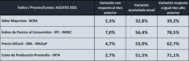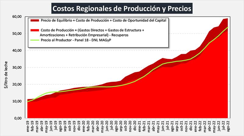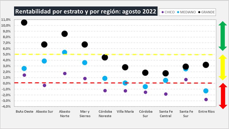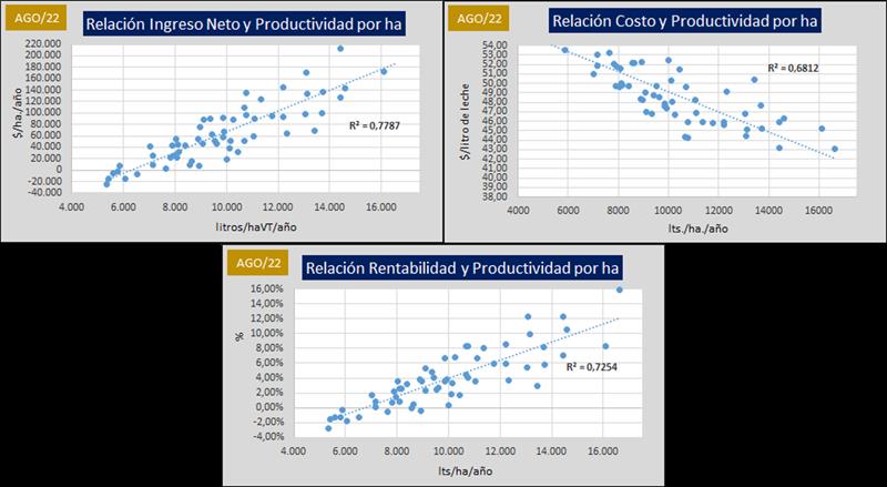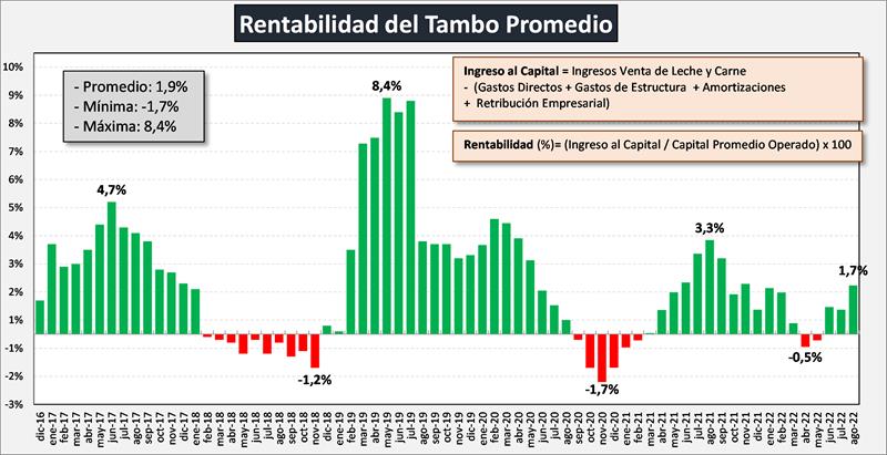 Costos Regionales de Producción de Leche, valores actualizados a AGOSTO del 2022 20/9/2022![]() Precio al Productor: en base al precio por provincia de DNL – MAGyP (SIGLeA-LUME), calidad y volumen de cada tambo en los 30 modelos regionales. Costo de Producción: (Gastos Directos + Gastos de Estructura + Amortizaciones + Retribución Empresarial) – Recuperos (venta y/o cesión de terneros, y vacas y toros de rechazo). Precio de Equilibrio: Costo de Producción + Costo de Oportunidad al Capital (5%). Ingreso al Capital: (Ingreso por Leche + Ingreso por Carne) - (Gastos Directos + Gastos de Estructura + Amortizaciones +Retribución Empresarial). Rentabilidad: (Ingreso al Capital / Capital) x 100 Rentabilidad Cuando el precio comienza a superar al Costo de Producción, se genera Ingreso al Capital positivo y por ende Rentabilidad. La decisión de evaluar otra alternativa como destino del capital, surge de comparar la tasa de rentabilidad de la producción de leche y la tasa de la inversión alternativa. ![]() La tasa de rentabilidad promedio en agosto de 2022 continuó en el cuadrante positivo con el 1,7%. En el período analizado (dic16-ago22) la tasa de rentabilidad promedio fue del 1,9% con un máximo del 8,4% y un mínimo de -1,7%. La macro, los precios y los costos ![]() El Costo de Producción Promedio subió en agosto de 2022 un 2,7% respecto al mes anterior, un 51,5% en el período enero-agosto y llega a un 71,1% de variación interanual. En la variación anual (ago22/ago21) el costo se ubica por debajo de la suba inflacionaria (IPC) y algo más de 8,4 puntos porcentuales por encima del precio recibido (SIGLeA), y este último estuvo prácticamente igual que los Precios Mayoristas de INDEC, conocidos como en Salida de Fábrica (62,1%) y bastante por encima del precio de la LPE exportación en pesos (55%). Para el mes actual (septiembre 2022) va a tener una importante incidencia en los costos de producción el efecto del “dólar soja” que incidirá fuertemente en los costos de alimentación y hay que ver aún si tendrá efecto también en el precio de los arrendamientos pautados en quintales de soja (cabe recordar que más del 40% de la superficie dedicada a tambo es arrendada), que aunque se entiende no deben tener ese ajuste, habrá que ver que ocurre en la práctica. Según un análisis preliminar el incremento promedio en los costos de producción por el factor dólar soja podría ser de un 4,6% por alimentación y 2,1% por arrendamiento, es decir un 6,7% que se sumaría al aumento de restos de costos, y que seguramente no serán cubiertos por los incrementos de precios de la leche en función a los datos de mercado interno y externo hoy disponibles. Evolución del Precio Cobrado, Costos de Producción y Precio de Equilibrio ![]() Desde marzo de 2021 y hasta marzo 2022 el precio al productor (aunque con altibajos) superó al costo de producción de leche (relación superior a 1), pero en ningún momento alcanzó al precio de equilibrio, que exige una rentabilidad sobre el capital operado del 5% anual, ya que la rentabilidad promedio de ese período fue del 1,6% con extremos entre 0,0% y 3,3%. En abril y mayo el costo prácticamente iguala al precio percibido y genera tasas de rentabilidad levemente negativas (-0,2% y -0,5%) y en junio-agosto próximos pasados la rentabilidad vuelve a ratios positivos, cubriendo el Costo de Producción, pero aún distante del Precio de Equilibrio. Relación entre el Precio al Productor y el Costo de Producción: ![]() El Ingreso Neto, el Costo de Producción y la Rentabilidad tienen una vinculación muy fuerte con la Productividad medida en litros de leche producidos por hectárea y por año como puede visualizarse en los gráficos siguientes. ![]() Si observamos la tasa de rentabilidad en función al tamaño de los tambos y la región de producción, podemos ver que existe una gran dispersión en la tasa que se pude lograr respecto al capital promedio operado, en función a esas variables observadas. Además, podemos visualizar claramente que hay una diferencia estructural, respecto a la rentabilidad obtenida entre las regiones productivas, que tienen mucha vinculación con la escala y la incorporación de tecnologías de insumos y procesos que determinan muchas diferencias en la eficiencia y la productividad. ![]() Para un análisis completo de los Costos Regionales de Producción: https://www.ocla.org.ar/contents/newschart/portfolio/?categoryid=15 elaborado por el OCLA sobre la publicación de Costos Regionales de Producción - INTA