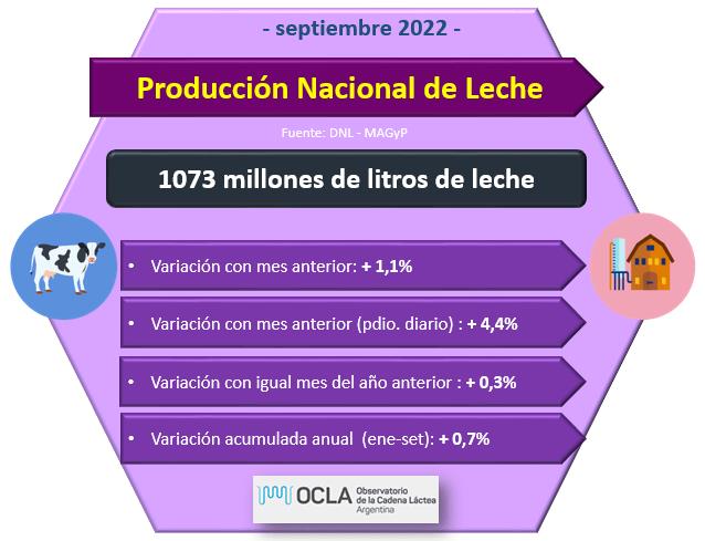 En el mes de septiembre de 2022 la producción fue de 1073,0 millones de litros de leche, esto implica un valor 1,1% por encima del mes anterior (+4,4% en el promedio diario) y un 0,3% más que igual mes del año anterior.