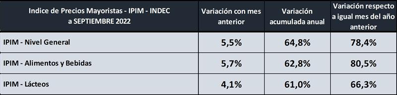 Índice de Precios Internos Mayoristas – IPIM – Lácteos – septiembre 2022 20/10/2022