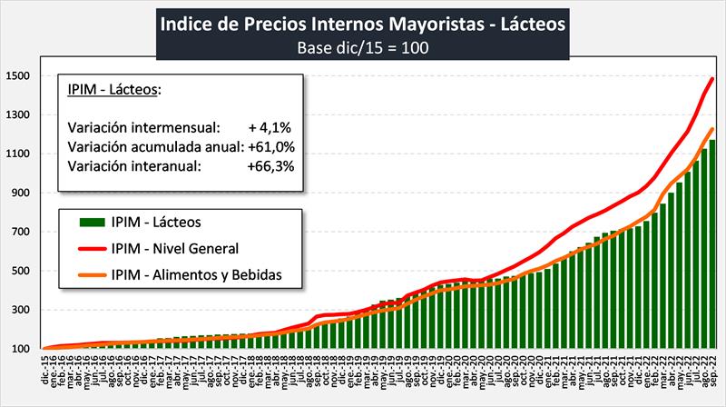 El índice mayorista de precios de los Lácteos registró un aumento de 4,1% en septiembre de 2022 respecto del mes anterior, 61,0% en el período enero-septiembre y acumula una suba del 66,3% en los últimos 12 meses.