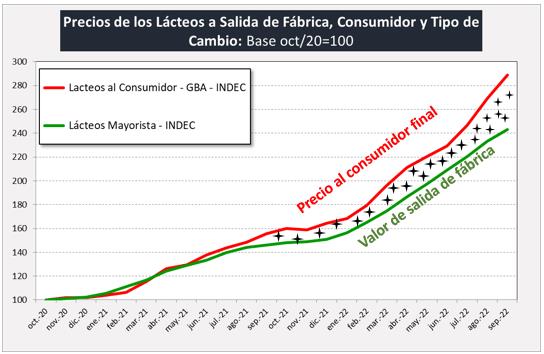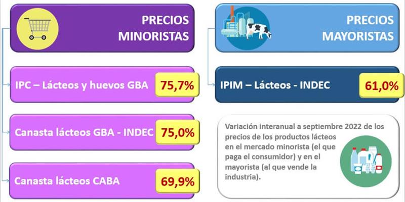 Si los comparamos con los precios de los lácteos del índice de precios minoristas (con datos de GBA ya que no hay un índice lácteo minorista nacional), que presentaron a septiembre de 2022 una suba interanual del 75,0%, están los precios mayoristas de los lácteos 14,7 puntos porcentuales por debajo. Y si lo hacemos con los precios de la Ciudad Autónoma de Bs. As., la diferencia es de 8,9 puntos por debajo.