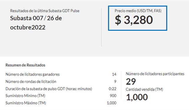 La Subasta Nº 007 se ha llevado ha cabo en el día de hoy, martes 25 de octubre, donde el precio promedio obtenido para la LPE ha sido de 3.280 US$/t , lo que implica una baja de 4,2% respecto a lo publicado en la última GDT pulse (3.425 US$/t) y también una baja muy similar (-4,1%) respecto al último evento del GDT nº318 (3.421 US$/t). Tanto en los eventos como en estas subastas intermedias, los precios presentan bajas.