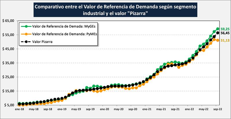 Se observa en el gráfico (como es habitual), una mayor capacidad de pago en el mes de agosto/22 del segmento de MyGEs que del segmento PyMEs, $ 59,25 y $ 51,13, respectivamente. La capacidad de pago de las MyGES estuvo $ 2,80 por encima del precio real pagado y el de las PyMEs $ 5,32 por debajo.