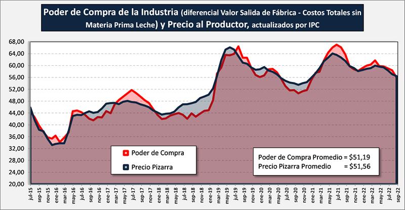 Es el vigécimo primer mes consecutivo en que el poder de compra de la leche de las MyGEs es superior al precio realmente liquidado y luego de un largo período en que el precio de las PyMEs estuvo por debajo del precio real pagado, en julio y agosto del año pasado, el poder de compra superó al precio y de septiembre/21 hasta septiembre/22, vuelve a estar por debajo. Los efectos del control de precios y del mix derechos de exportación y retraso cambiario, hacen disminuir los poderes de la industria en general.