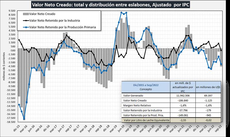El gráfico siguiente muestra los resultados sectoriales actualizados por IPC y en el cuadro se puede ver claramente qué en estos últimos casi 7 años, la cadena no retuvo del valor que generó, $ 2,55 o US$ 0,02 por litro de leche equivalente, perdiendo esa mayor diferencia el sector primario respecto al industrial (84/16).