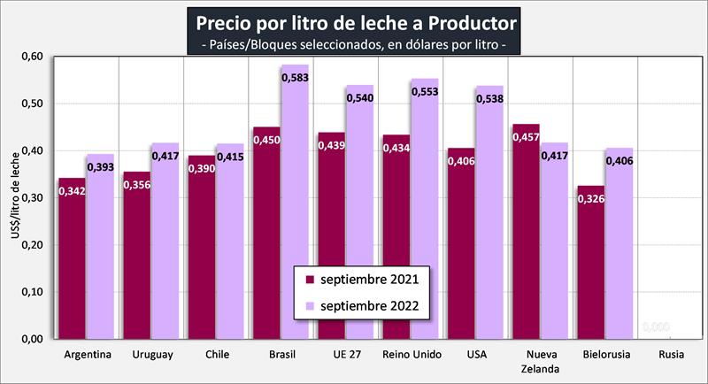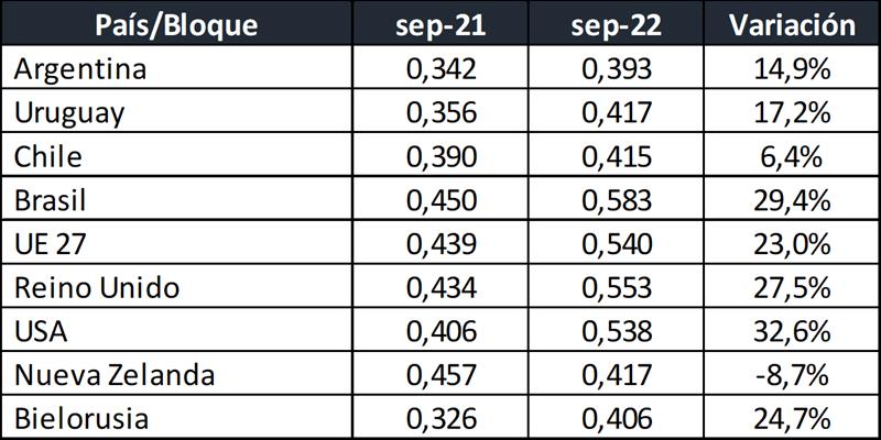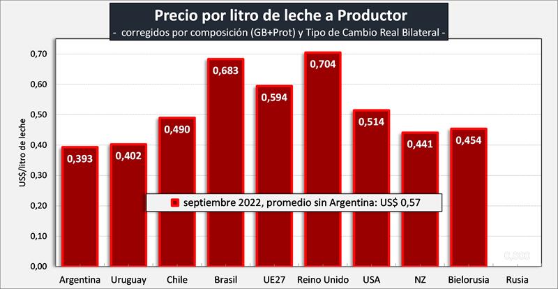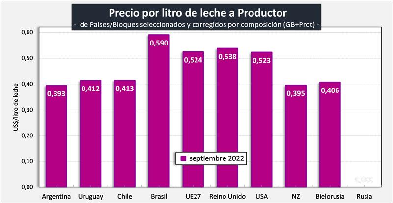Fuentes: DNL-MAGyP, INALE, ODEPA, CEPEA/ESALQ USP, MilkPoint, EMMO, AHDB, USDA y CLAL, respectivamente.