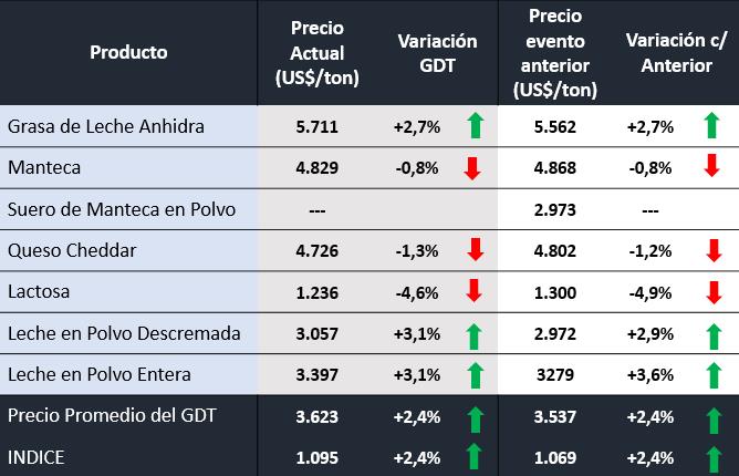 -GDT Price Index indica el promedio del cambio porcentual en los precios para cada especificación, ponderado por la cantidad de cada especificación vendida. GDT proporciona un cambio en el índice de precios de GDT del evento anterior para todos los productos, además de un equivalente para cada grupo de productos y cada combinación de grupo de productos/período de contrato. El índice de precios proporciona un reflejo más preciso de los movimientos de precios entre los eventos comerciales.