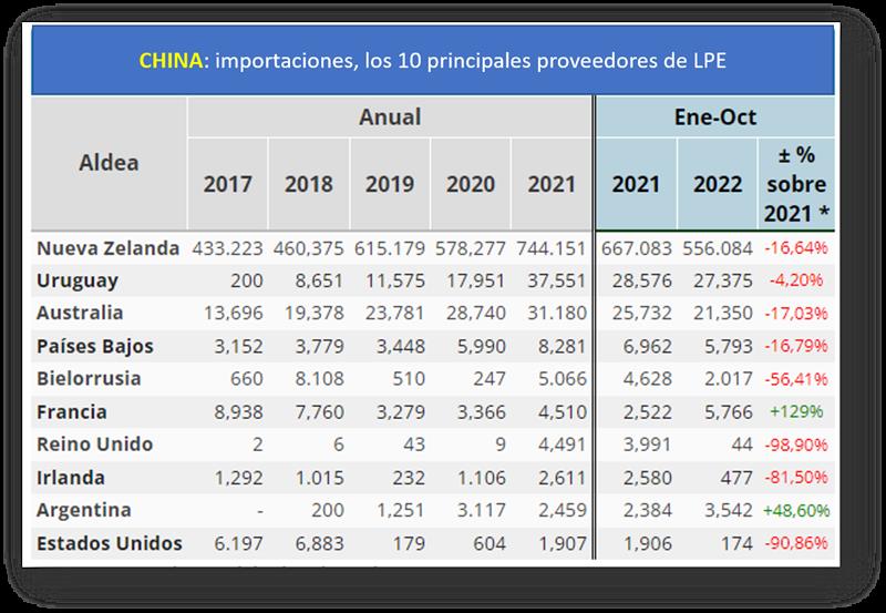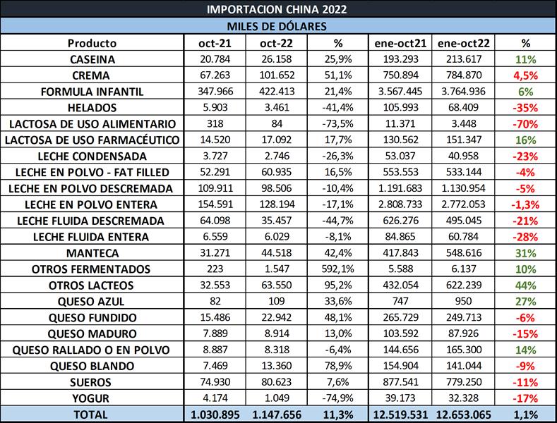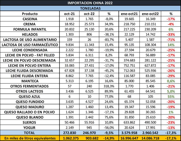 CHINA: importaciones de productos lácteos a octubre de 2022 22/11/2022