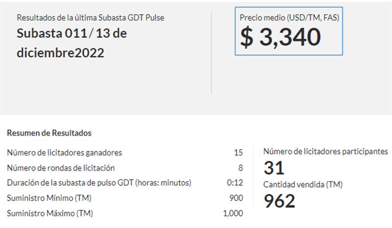 La Subasta Nº 011 se ha llevado ha cabo en el día de hoy, martes 13 de diciembre, donde el precio promedio obtenido para la LPE ha sido de 3.340 US$/t , lo que implica una suba de 1,8% respecto a lo publicado en la última GDT pulse (3.280 US$/t) y una baja de 1,8% respecto al último evento del GDT de hace una semana (3.400 US$/t).