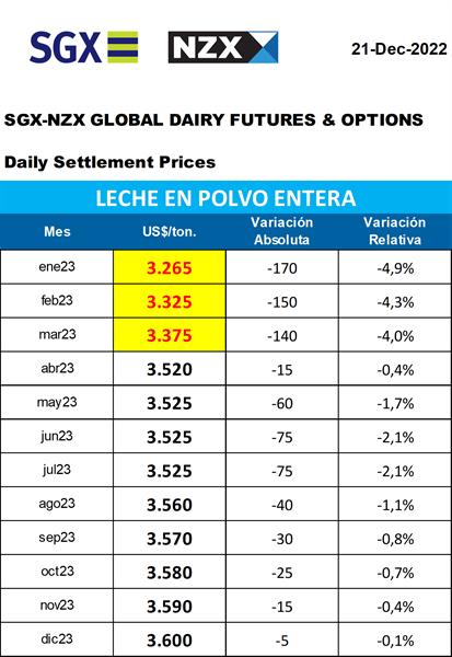 Mercado de Futuros NZX – Leche en Polvo Entera 22/12/2022
