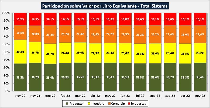 La participación del productor en el total del sistema fue para noviembre de 2022 del 36,4%, 1,1 puntos por encima del mes anterior, bastante por encima de la media del 31,8%. Un aumento de 1 punto en los valores finales de mercado interno y una mejora de 0,9 puntos porcentuales en la participación de los valores de mercado externo, colocándola solo 0,3 puntos por debajo de la media histórica de la serie disponible (64,1%). La participación del productor sobre el valor de salida de fábrica (precio al que vende la industria) fue de 59,1%, 1 punto encima del mes pasado y 5,8 puntos encima del promedio de la serie (53,3%). Cabe recordar que la serie histórica para los valores de salida de fábrica tiene una mayor extensión temporal que el resto.
