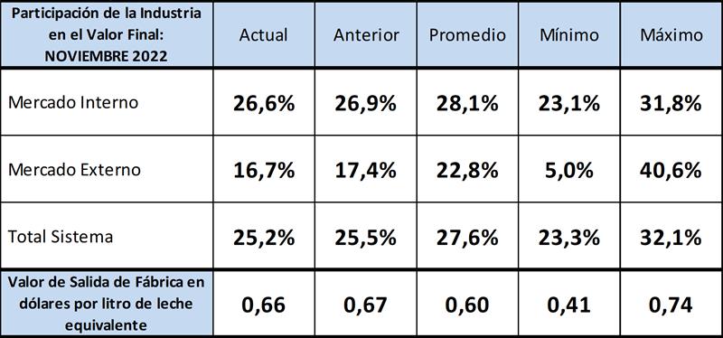 La industria empeora en noviembre de 2022 su performance de participación en el mercado interno (0,3 puntos), en el mercado externo empeora 0,7 puntos su importancia relativa y retrocede su participación en el total del sistema 0,3 puntos. La facturación total de salida de fábrica por litro de leche equivalente estuvo en US$ 0,66 (0,01 menos que el mes anterior), +US$ 0,06 que el promedio de la serie disponible y 8 centavos menos que el máximo logrado en mayo y octubre de 2013. Estos niveles de facturación en ambos mercados como en el total, están muy lejos de los valores que se logran en los principales países lecheros que se ubican en un valor cercano al dólar por litro equivalente (en planchada de fábrica) y que no se dan en Argentina por las interferencias entre el mercado y los actores de la cadena que mencionamos más arriba. Además, la mejora en los valores en dólares que se pueden observar, se debe últimamente más a un retraso del tipo de cambio que a una mejora del valor en pesos.