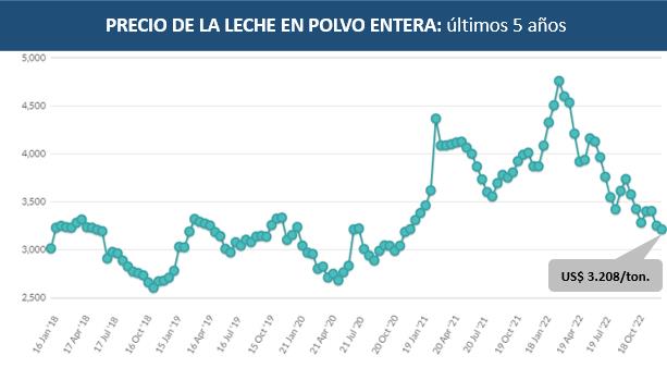 En la subasta del día de hoy, los precios de todos los productos han dismuído, situación que se repite respecto de la última subasta de diciembre de 2022. La Leche en polvo entera ha alcanzado el valor más bajo de los últimos dos años (3.208 US$/tn)