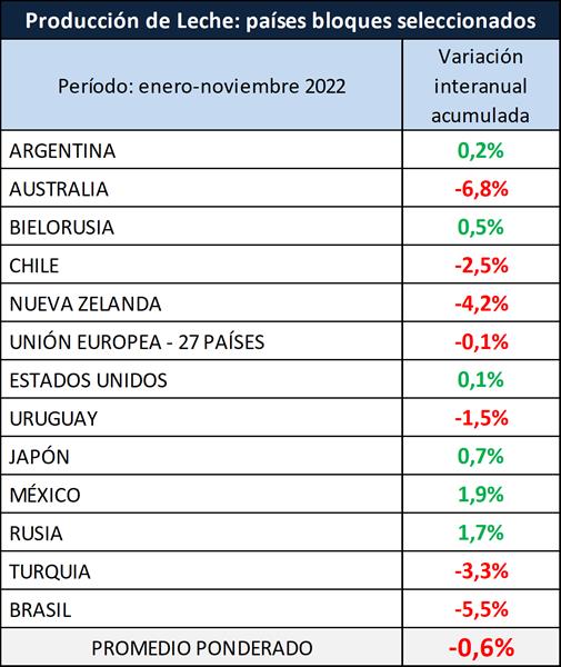 n el cuadro siguiente se toma un grupo seleccionado de los principales países que representan alrededor del 55% de la producción mundial de leche de vaca, en el cual se puede observar una caída de la producción del 0,6%, para el período enero-noviembre de 2022 respecto a igual período del año anterior.