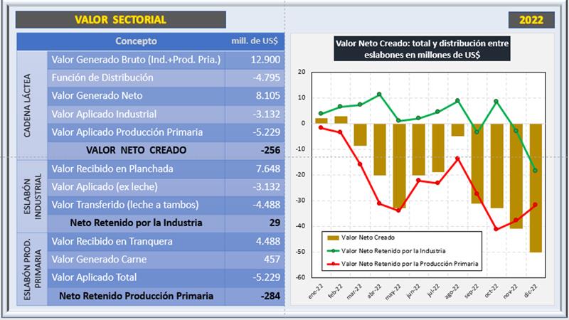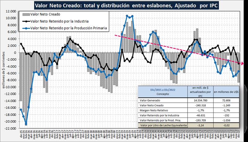 La cadena presenta un resultado negativo en diciembre de 2022 de $ 8.684 millones (4,9 centavos de dólar por litro de leche equivalente). El sector industrial tiene un resultado estimado negativo de $ 3.207 millones y quien lleva la mayor pérdida es el sector primario con $ 5.478 millones (unos $ 5,32/litro o US$ 3,1 centavos por litro de leche), lo que indicaría un precio de equilibrio necesario en torno de los $ 73 para cubrir todos los costos operativos y el costo de oportunidad del capital.