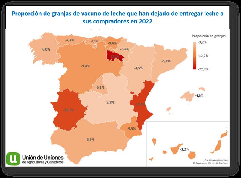 Con los resultados de 2022, Unión de Uniones informa que a diciembre de 2022 quedaban en España 10.665 tambos de vacuno de leche, habiendo descendido su número en 782 tambos (-7% con 2,1 tambos menos al día).