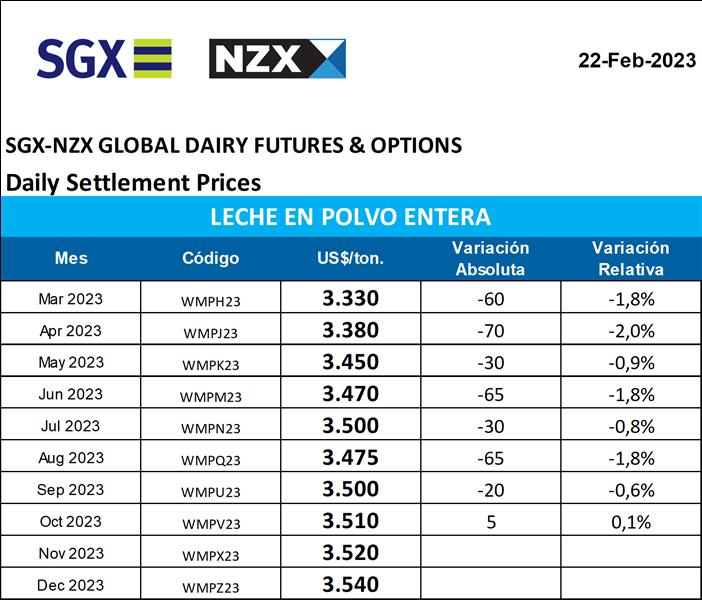 Mercado de Futuros NZX – Leche en Polvo Entera 22/2/2023
