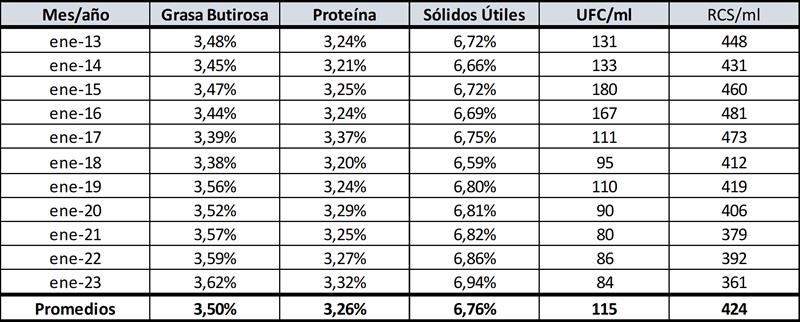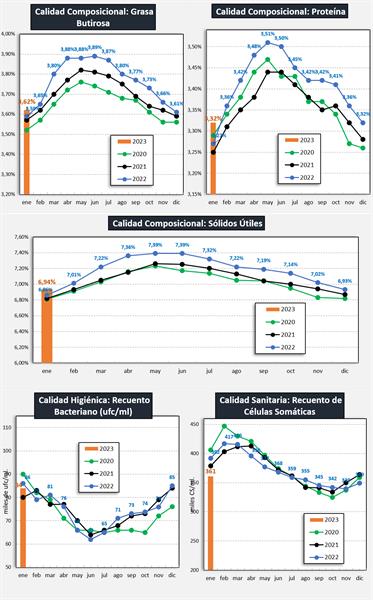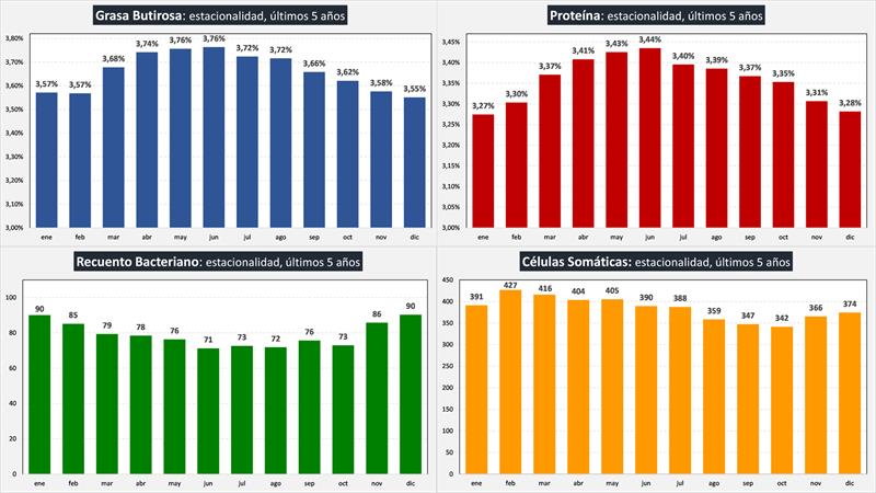 Calidad de Leche 26/2/2023Leche de Referencia ![]() Art. 9° - Resolución N° 229/2016 SIGLeA en términos del art. 2° de la Resolución Conjunta N° 739 y N° 495/2011. Precio Promedio del Mes Actual: ![]() Evolución de la Calidad de Leche ![]() Evolución Mensual de la Calidad, últimos años ![]() Estacionalidad de la Calidad de Leche ![]() elaborado por el OCLA con datos de la DNL-MAGyP