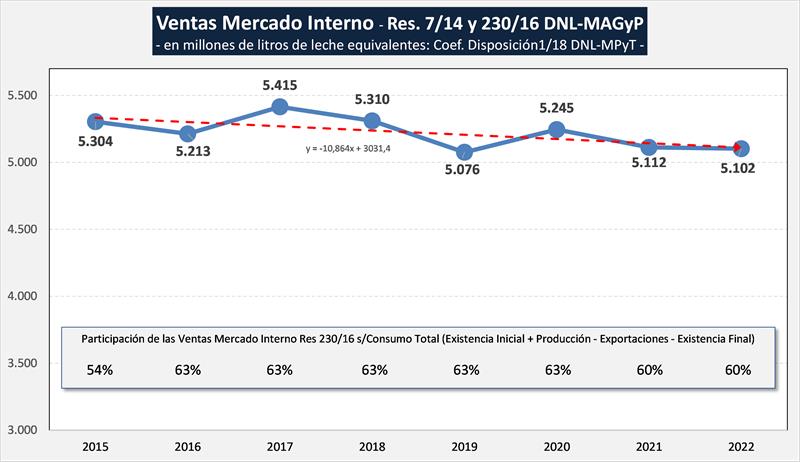 En el gráfico siguiente se puede ver la evolución de las ventas que captura la resolución, medida en litros de leche equivalente y el porcentaje que esas ventas representan del total de leche consumida en el mercado interno según el Balance Lácteo, quedando fuera de análisis alrededor del 40% de las ventas de productos lácteos en el mercado doméstico.