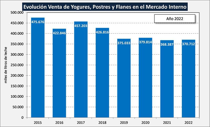 Por otra parte, en el gráfico de abajo se ve cómo productos como las leches saborizadas o chocolatadas, que presentaron una muy alta tasa de crecimiento en el año 2022 (13,4%), es sólo por efecto de comparar con un año donde las ventas fueron extremadamente bajas, ya que se continúa con la tendencia de caída de esta categoría. Situación muy similar presenta el gráfico que le sigue de yogures, postres y flanes.