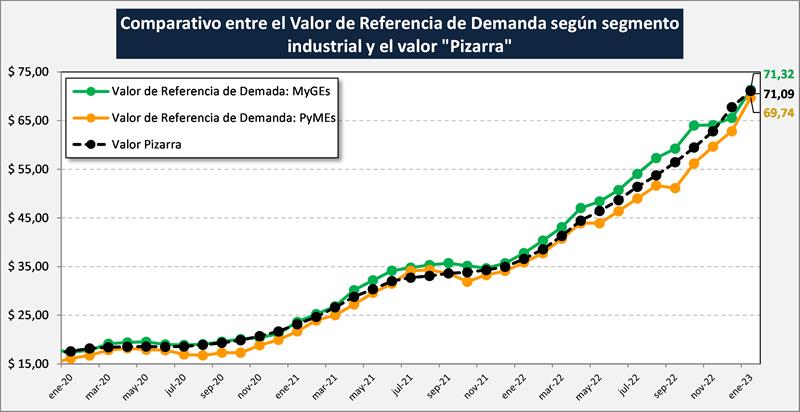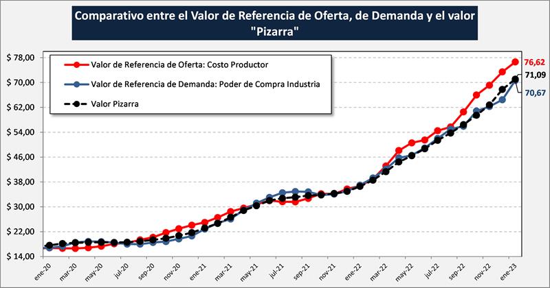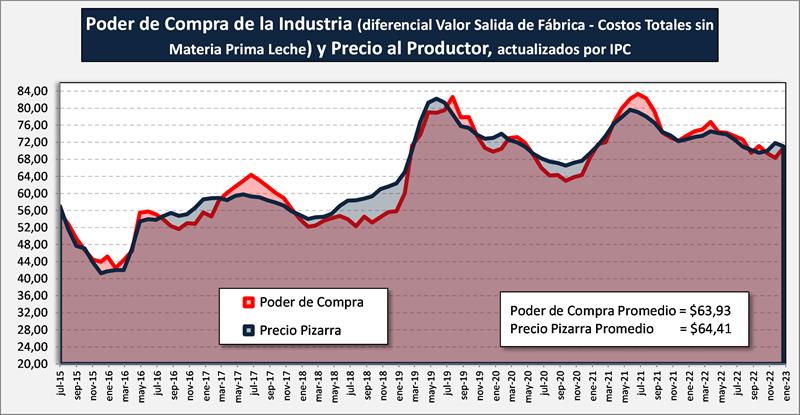 Valores de Referencia de Mercado – Poder de Compra de la Industria 1/3/2023Valores de Referencia: Valor de Referencia de Oferta: expresa la necesidad de ingreso por litro de leche del sector de producción primaria (gastos directos + gastos de estructura + amortizaciones + una tasa de interés al capital). Valor de Referencia de Demanda: expresa la capacidad de pago por litro de leche cruda por parte de las industrias lácteas, en condiciones normales de operación y sin margen de renta alguno por encima del costo de oportunidad al capital incluido. Valor Pizarra: precio publicado por la DNL-MAGyP en base a la muestra de 18 empresas. En el siguiente gráfico se comparan estas tres variables como promedio de todas las industrias: ![]() En el mes de enero de 2023 la capacidad de pago según IAPUCo llegó a $ 70,67/litro de leche y fue $0,42/litro, inferior al precio real pagado que fue para ese mes de $ 71,09 (Precio Panel 18 Empresas usado desde un inicio en los análisis mensuales, $ 69,98 SIGLeA). Si observamos el comportamiento del Valor por Litro Equivalente de Salida de Fábrica (precio al que vende la industria), subió un 8,6% respecto al mes anterior (90,2% de incremento interanual) y el precio al Productor aumentó un 4,9% (+94,3% interanual). Por su parte, el Valor de Referencia de Oferta o Costo del Productor estuvo en $ 76,62/litro, $ 5,53 por encima del precio cobrado. El valor de referencia de oferta o costo de producción se incrementó 4,4% en el intermensual y 108,4% en su comparación interanual (en el cálculo de VRO es decir con costo de oportunidad al capital calculado de igual forma para Producción Primaria e Industria, ya que Costos Regionales INTA tiene un costo de oportunidad superior: 5% sobre Capital Promedio Operado). Variaciones Interanuales: Valor de Salida de Fábrica: +90,2% (valor por litro equivalente al que vende la industria) Costo del Producción: +108,4% (Costo Total que incluye interés al capital) Precio al Productor: +94,3% (Precio Panel 18 – DNL MAGyP) La situación observada en las variaciones interanuales, pone en evidencia que el incremento anual del valor de salida de fábrica (precio al que vende la industria) está por debajo del incremento anual de su principal costo de producción (la materia prima leche), debido fundamentalmente al gran diferencial que se viene observando entre precios mayoristas y minoristas (de más de 20 puntos, como indicamos en el informe respectivo: https://www.ocla.org.ar/contents/news/details/25657632. Además, a pesar de que el precio real pagado ha crecido muy cerca de la inflación, al productor tampoco el número le cierra, debido a que está muy por debajo del costo total de producción o precio de equilibrio. Esto determina los resultados negativos de la cadena en su conjunto y sobre todo en enero 2023, de sus dos principales eslabones. En el gráfico de abajo se subdivide la capacidad de pago o valor de referencia de demanda, entre las denominadas Megas y Grandes Empresas (MyGEs) y Pequeñas y Medianas Empresas (PyMEs). Cabe acotar dos cosas, la primera es que la capacidad de pago calculada es sobre la base del cumplimiento total de las obligaciones impositivas, y en segundo lugar que como ya lo hemos marcado, el precio real pagado, independientemente de la capacidad de pago de cada tipo de empresa, surge por las fuerzas que se dan en el mercado. Se observa en el gráfico una mayor capacidad de pago, como es habitual, en el mes de enero/23 del segmento de MyGEs que del segmento PyMEs, $ 71,32 y $ 69,74, respectivamente. La capacidad de pago de las MyGES estuvo $ 0,23 por arriba del precio real pagado, recordando que él mes pasado, como hacía mucho no ocurría, la capacidad de pago estuvo por debajo del precio. Por su parte las PyMEs estuvieron $ 1,35 por debajo en su capacidad de pago respecto al precio promedio liquidado. Los efectos del control de precios y del mix conformado por los derechos de exportación y retraso cambiario (hoy exacerbados por la caída de precios internacionales), hacen disminuir los poderes de compra de la industria en general, y es posible, de no mediar algún cambio significativo en el mercado o las políticas económicas que influyen sobre el sector, que la situación de resultados negativos se profundice en los próximos meses. ![]() Viendo el precio pizarra liquidado y comparado con la capacidad de pago promedio de la industria, actualizada por IPC, para un período más prolongado, puede observarse que en el largo plazo (salvo oscilaciones temporales) los valores promedio convergen: $ 64,41 por litro de Precio Pizarra y $ 63,93 por litro de Poder de Compra. Los factores estacionales de la producción, menor oferta de leche (enero-mayo) y mayor oferta (julio-noviembre), además de la mayor concentración de sólidos en el período marzo-mayo, respecto a septiembre-noviembre, influyen en la determinación de los precios incluso por encima o por debajo de los “poderes de compra” (valores de referencia de demanda), que como se dijo más arriba, son eso, el diferencial entre los ingresos y todos los costos ex materia prima leche, sin considerar ganancia alguna más que la tasa de alrededor del 3% como costo de oportunidad del capital. ![]() Algunos comentarios que pueden servir para el análisis: El poder de compra que se determina es el resultante de deducir del valor de salida de fábrica el total de costos sin considerar la materia prima leche y sin ningún nivel de resultado empresarial por encima de un costo de oportunidad que se calcula de igual manera para la industria como para el sector primario. Por lo tanto, el Valor de Referencia o Poder de Compra no significa Precio al Productor, en algunos momentos el Precio al Productor supera el Poder de Compra por circunstancias del mercado y en otras ocurre a la inversa, obviamente produciéndose resultados negativos o positivos, respectivamente para la industria. Se trata en todos los casos de modelos para “condicio
