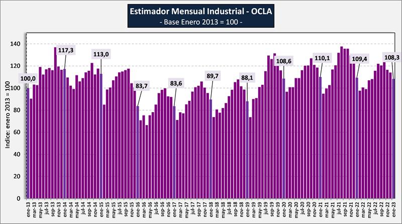 El EMI-OCLA asciende a 108,3 en enero de 2023, valor 5,1% inferior al mes anterior y bajó el 1,0% respecto a igual mes del año anterior.