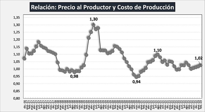 Desde marzo de 2021 y hasta marzo 2022 el precio al productor (aunque con altibajos) superó al costo de producción de leche (relación superior a 1), pero en ningún momento alcanzó al precio de equilibrio, que exige una rentabilidad sobre el capital operado del 5% anual, ya que la rentabilidad promedio de ese período fue del 1,6% con extremos entre 0,0% y 3,3%. En abril y mayo el costo prácticamente iguala al precio percibido y genera tasas de rentabilidad levemente negativas (-0,2% y -0,5%) y en junio22-enero23 próximos pasados la rentabilidad vuelve a ratios positivos, cubriendo el Costo de Producción, con ratios muy bajos y muy lejos del precio de equilibrio.