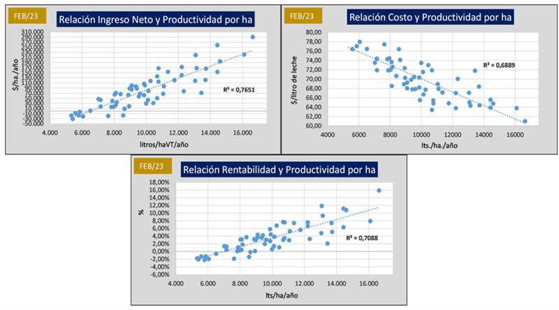 El Ingreso Neto, el Costo de Producción y la Rentabilidad tienen una vinculación muy fuerte con la Productividad medida en litros de leche producidos por hectárea y por año como puede visualizarse en los gráficos siguientes