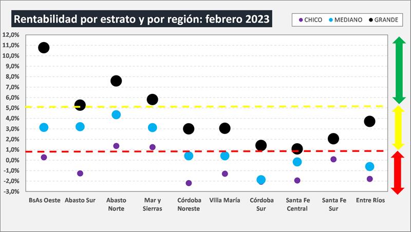 La tasa de rentabilidad promedio en febrero de 2023 continuó en el cuadrante positivo con el 1,4%. En el período analizado (dic16-feb23) la tasa de rentabilidad promedio fue del 1,8% con un máximo del 8,4% y un mínimo de -1,7%. Recordamos que la tasa a la que se exige el capital promedio operado (campo propio, instalaciones, animales, maquinarias, equipos y circulante) para determinar el costo de oportunidad es del 5% anual.
