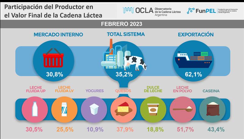 La participación del productor en el total del sistema fue para febrero de 2023 del 35,2%, 1,0 puntos por debajo del mes anterior, bastante por encima de la media del 31,9%. Una disminución de 1 punto en los valores finales de mercado interno y una caída de 0,7 puntos porcentuales en la participación de los valores de mercado externo, colocándola 1,9 puntos por debajo de la media histórica de la serie disponible (64,0%). La participación del productor sobre el valor de salida de fábrica (precio al que vende la industria) fue de 58,3%, 0,7 punto debajo del mes pasado y 4,8 puntos encima del promedio de la serie (53,5%).