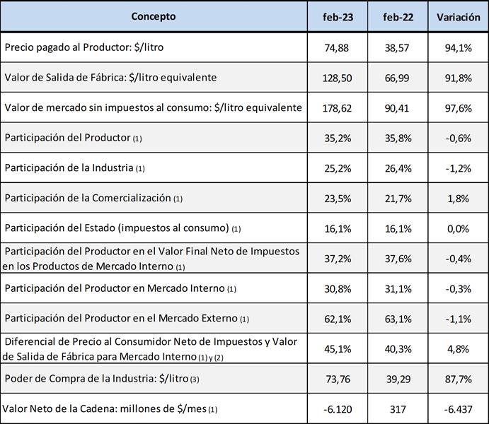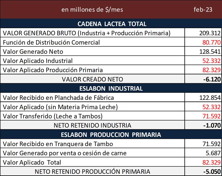 La cadena presenta un resultado negativo en febrero de 2023 de $ 6.120 millones (4,0 centavos de dólar por litro de leche equivalente). El sector industrial tiene un resultado estimado negativo de $ 1.070 millones y quien lleva la mayor pérdida es el sector primario con $ 5.050 millones (unos $ 6,27/litro o US$ 3,3 centavos por litro de leche), lo que indicaría un precio de equilibrio necesario en torno de los $ 81 para cubrir todos los costos operativos y el costo de oportunidad del capital.
