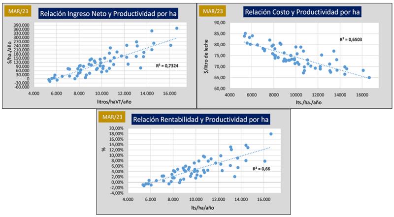 El Ingreso Neto, el Costo de Producción y la Rentabilidad tienen una vinculación muy fuerte con la Productividad medida en litros de leche producidos por hectárea y por año como puede visualizarse en los gráficos siguientes.